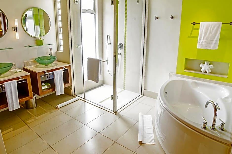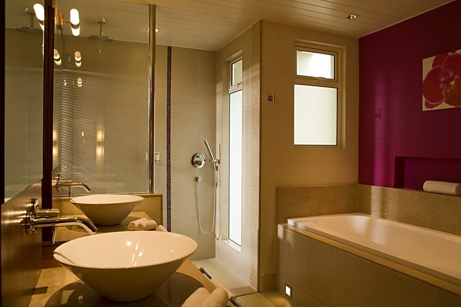 It features a bathtub with walk-in shower, AC, Sateliite TV, mini-bar. Ipod dock, French press, kettle , tea & coffee, bathrobe & slippes and safe.